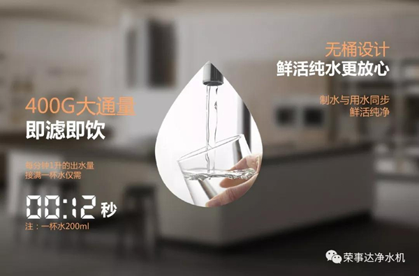 為提升用戶的“時(shí)效”體驗(yàn),榮事達(dá)400G智能反滲透凈水機(jī)從一開(kāi)始產(chǎn)品定位就是400加侖出水速度,具體是什么概念呢?200ml一杯水,12秒就可以接滿,創(chuàng)新定制的400G大通量濾芯出水速度約為常規(guī)50G凈水機(jī)的8倍,隨時(shí)飲水無(wú)需等待,為生活留下更多時(shí)間欣賞窗外美景。