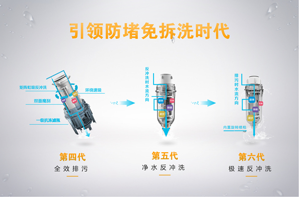 此次榮事達智能前置過濾器系列所帶來的最大不同,便是其獨有的“防堵免拆洗技術”。作為企業定向研發的專利技術,有效解決了前三代傳統前置過濾器“易堵塞,拆洗難”的致命弊病,五款新品從第四代到第五代再到第六代,可以說是防堵免拆洗技術的梯度升級。