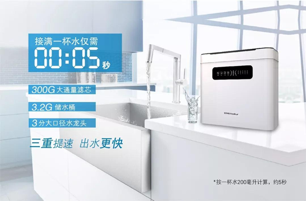 現代快節奏的生活下,人們對于“速度”的追求越發執著。此次,榮事達發布的300G智能反滲透凈水機在出水速度提升上可謂是“不走尋常路”。其創新采用“大通量+大‘桶’量+大口徑龍頭”三重提速設計,一方面選用“300加侖超大通量濾芯”,出水速度達到傳統50G凈水機的6倍;另一方面,用戶可DIY選裝3.2加侖儲水桶,搭配三分大口徑凈水龍頭,進一步強化出水效率,接滿一杯200毫升水僅需5秒,讓用戶隨時享受不等待、不斷水的理想生活。