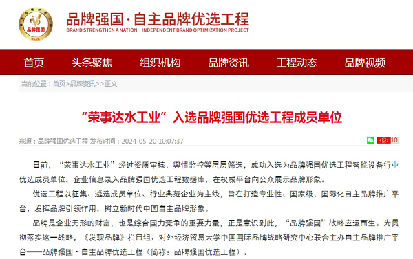 日前,“榮事達水工業”經過資質審核、輿情監控等層層篩選,成功入選為品牌強國優選工程智能設備行業優選成員單位,企業信息錄入品牌強國優選工程數據庫,在權威平臺向公眾展示品牌形象。