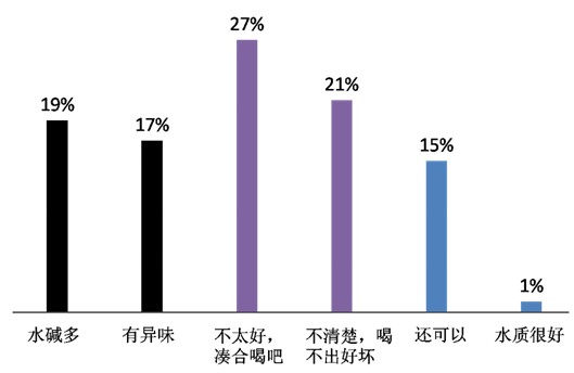 圖1. 對所住地區自來水的直觀感受另外有兩成(21%)被訪者表示“不清楚,喝不出好壞”——百姓飲用水成本越來越高,為了水杯里的安全,多數人選擇水消費:購買桶裝水、安裝自來水凈化器、從小區凈水機打水成為主流選擇,購買安全飲水正為成百姓居家繼“柴米油鹽醬醋茶”之后的“開門第八件事”。六成(59%)被訪者平時飲用水的最主要來源是“自來水/井水(燒開)”。也有不少人購買桶裝水(19%)或是從小區凈水機打水(8%)來飲用。“家里安裝自來水凈化器”的被訪者也不少,為11%。