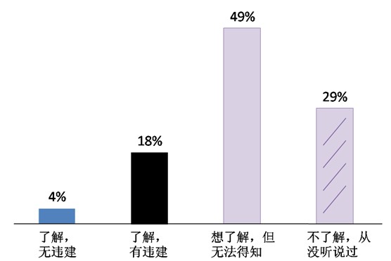 圖5. 對所住地區飲用水水質超標現象的感受我國劃分了飲用水水源的一級、二級保護區。《中華人民共和國水污染防治法》規定,在一級保護區內,禁止與供水設施和保護水源無關的建設項目;二級保護區內,禁止排放污染物的建設項目。——對“飲用水水源保護區”這一攸關群眾飲水安全和健康權的規定,只有兩成群眾表示“了解”,并明確地告訴我們“有違建項目”(18%)或“無違建項目”(4%)。八成被訪者對此并不知曉,29%的人“從沒聽說過”,也并沒有想要了解的意愿。半數(49%)被訪者“想了解”,但無奈于“信息不透明,無法得知”。