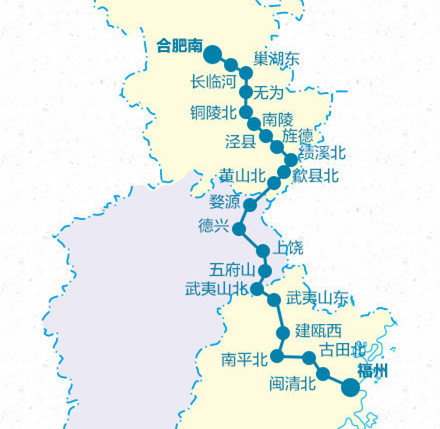 合福高鐵是京福高鐵的重要組成部分,全長806公里,是國內(nèi)第四條設(shè)計(jì)時速350公里的雙線電氣化高速鐵路。作為溝通華中與華南地區(qū)的一條大能力客運(yùn),途經(jīng)安徽、江西和福建三省,由于其線路貫穿武夷山、三清山、婺源、黃山多個著名旅游景區(qū)而被稱為國內(nèi)顏值最高的最美高鐵。