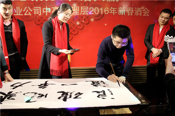 酒會(huì)上,雷鳴董事長(zhǎng)作了重要講話,向全體中高管理層成員拜年,感謝全體成員一年來(lái)為公司發(fā)展辛苦的付出與努力,并希望新的一年大家共同努力,讓公司繼續(xù)大展宏圖、欣欣向榮。之后,各分公司、事業(yè)部、部門紛紛以創(chuàng)新、幽默、多樣的方式向全體參會(huì)人員拜年。生產(chǎn)制造中心以喜慶的春聯(lián)為依托,在表達(dá)新春祝福的同時(shí),還帶來(lái)了印有“安全第一 質(zhì)量為本”字樣的員工集體簽名橫幅,為確保產(chǎn)品質(zhì)量作出承諾;凈水家電事業(yè)部總經(jīng)理王悅生的現(xiàn)場(chǎng)即興題字,用丹青妙筆表達(dá)了其部門成員奮勇爭(zhēng)先的目標(biāo)和信心;工程事業(yè)部總經(jīng)理劉東帶領(lǐng)其部門成員所采用的“三句半”拜年方式贏得了滿堂喝彩;財(cái)務(wù)部與企劃部共同合作的“異口同聲”有獎(jiǎng)競(jìng)猜創(chuàng)意拜年,更是傳達(dá)了“榮事達(dá)一家親”的美好寓意。