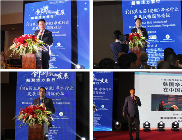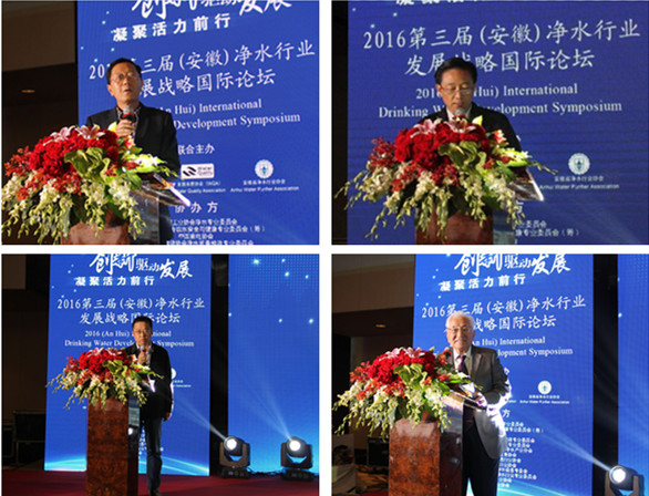 中國凈水行業專家網王占生教授、美國水質協會中國事務總監丁鵬先生、安徽省凈水行業協會王六一會長上臺致辭,歡迎廣大與會專家、學者、企業家解析國內外凈水市場發展現狀、特點,分享企業創新發展的理念、思路,研討新形勢下凈水行業發展內容、發展方向、發展趨勢,為凈水行業的快速、健康發展開闊思路。