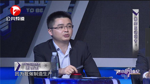 在5月12日播出的節(jié)目中,王悅生總經(jīng)理與其他在場(chǎng)嘉賓一同聆聽了三位選手的創(chuàng)業(yè)項(xiàng)目及融資計(jì)劃。王總結(jié)合自己豐富的項(xiàng)目運(yùn)營(yíng)及市場(chǎng)運(yùn)作經(jīng)驗(yàn),幫助選手分析項(xiàng)目市場(chǎng)前景、投資價(jià)值和未來發(fā)展方向,并針對(duì)項(xiàng)目的運(yùn)作模式、產(chǎn)品的規(guī)范化生產(chǎn)等方面提出了專業(yè)的、極具參考價(jià)值的建議,助力選手實(shí)現(xiàn)品牌發(fā)展與財(cái)富積累的最大價(jià)值,得到了現(xiàn)場(chǎng)嘉賓、參賽者、觀眾的一致認(rèn)可,掌聲不斷。