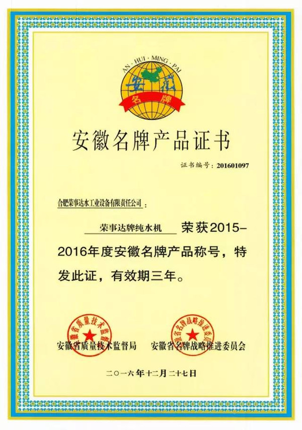日前,安徽省質(zhì)量技術(shù)監(jiān)督局、安徽省名牌戰(zhàn)略推進委員會正式公示2015-2016年度安徽名牌產(chǎn)品榜單,合肥榮事達水工業(yè)設(shè)備有限責(zé)任公司申報的“榮事達牌純水機”產(chǎn)品榮列榜中,成為安徽凈水行業(yè)首家榮獲省級“名牌產(chǎn)品”稱號的企業(yè),榮事達水工業(yè)公司強勁實力再次獲得政府和社會的充分肯定。