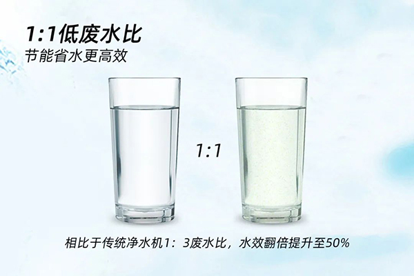 在提升用戶體驗的同時,榮事不斷追求節水技術的升級,以創新科技實現1:1超低廢水比。400G智能反滲透凈水機相比于傳統凈水機的1:3廢水比,出水效率由25%翻倍提升至50%,大大減少廢水排放,不僅節能環保,而且也節省了每一個家庭的生活開支,備受消費者喜愛。